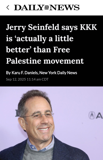 “By saying ‘Free Palestine,’ you’re not admitting what you really think. So it’s actually — compared to the Ku Klux Klan, I’m actually thinking the Klan is actually a little better here, because they can come right out and say, ‘We don’t like Blacks, we don’t like Jews.’ Okay, that’s honest,'" the Chronicle reported Seinfeld said.