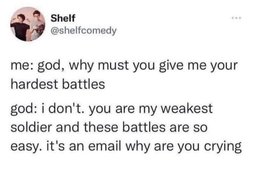 I’m one of God’s weak soldiers and I relate, although I’m sure He wouldn’t mock our weakness, lol. This is why it’s important to be empathetic and have a softer approach to people as much as we can afford it!