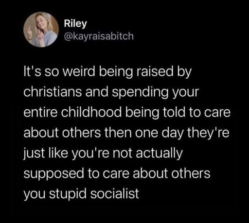 Literally so hard this. I was raised by christians and they were disappointed when I turned out to not be a christian adult. I tried so hard to point out the hypocrisy of them teaching me to always treat others with respect and to “do unto others as you would have them do unto you” but being hardcore right-wingers and trump supporters, being racists af and hating trans and queer people. They still don’t seem to get it.