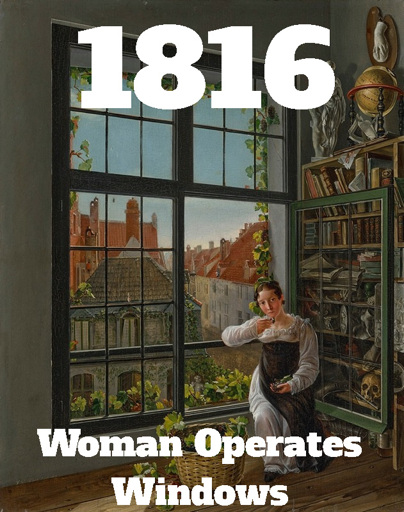 The image is a painting titled “Woman at a window, Mechelen, 1816” by the Belgian artist Frans Vervloet. Superimposed is the text “1816: Woman Operates Windows.”