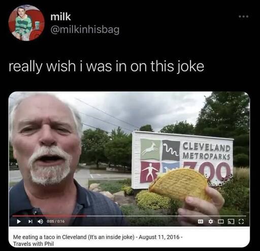 i don’t have the rest of the meme screenshotted, but the joke is that the guy hates Cleveland for some reason and ALSO hates hard shelled tacos because they fall apart. It become an inside joke to combine those two things say as a sort of “when pigs fly” type of thing. He visited Cleveland and took a video of him eating a hard shelled taco for the inside joke.