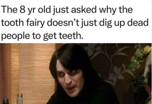 My kid and I had a conversation about this. I said it was weird a little fairy was flying around with a huge sack of kids teeth, like wtf was she doing with them? Pretty disgusting. We don’t trust the tooth fairy.