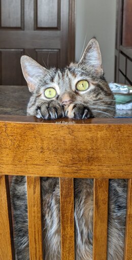 Giant cat, the size of a grizzly bear, but somehow with the proportions of a chubby house cat. It’s primary prey is mega rich humans. Continuous exposure to greed in such humans lends their flesh an exquisite and deeply savory scent and flavor that the cat can smell from hundreds of km away. Like all cats they take pleasure in toying with their prey, refining their technique and cunning by repeatedly capturing billionaires, then letting them just barely escape, only to hunt and catch them again, until the thrill of the hunt or hunger overcomes them, or their toy succumbs to the chase. Friend to the destitute, the homeless, the impoverished, and all the proletariat. The cat is gentle and loving to all who respect it and want not for the fruits of others labor.