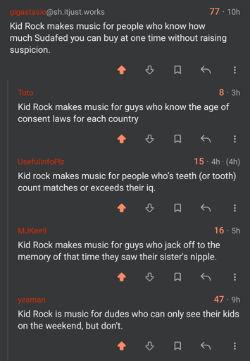 paranoid@lemmy.world to Lemmy Shitpost@lemmy.world · 1 day agoKid Rock is the people version of an above ground poollemmy.worldimagemessage-square12fedilinkarrow-up1295arrow-down14file-text