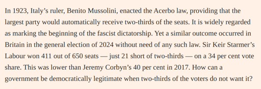 arrow-up189arrow-down1imageTIL that Benito Mussolini, enacted the Acerbo law, providing that the largest political party would automatically receive two-thirds of the seatssh.itjust.worksValnao@sh.itjust.works to Today I Learned@lemmy.worldEnglish · edit-21 month agomessage-square1fedilink