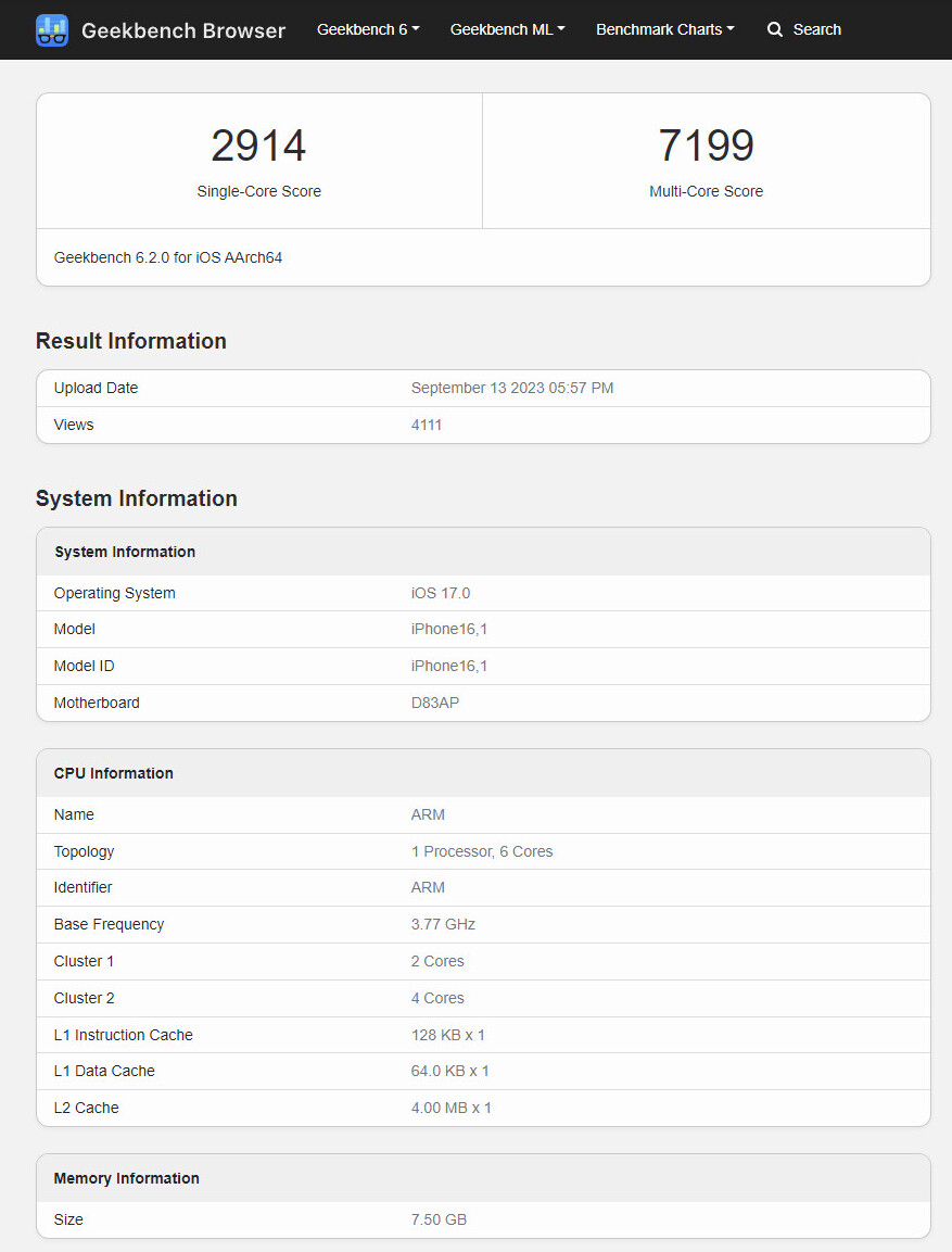An Apple “iPhone16,1” was put through the Geekbench 6.2 gauntlet earlier this week—according to database info this pre-release sample was running a build of iOS 17.0 (currently in preview) and its logic board goes under the “D83AP” moniker. It is interesting to see a 16-series unit hitting the test phase only a day after the unveiling of Apple’s iPhone 15 Pro and Max models—the freshly benched candidate seems to house an A17 Pro SoC as well. The American tech giant has set lofty goals for said flagship chip, since it is “the industry’s first 3-nanometer chip. Continuing Apple’s leadership in smartphone silicon, A17 Pro brings improvements to the entire chip, including the biggest GPU redesign in Apple’s history. The new CPU is up to 10 percent faster with microarchitectural and design improvements, and the Neural Engine is now up to 2x faster.”